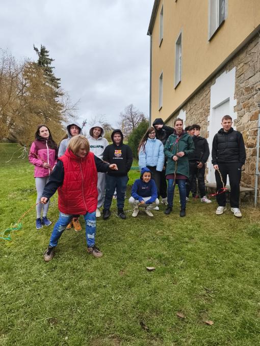 Velikonoce jsme si užili s předstihem. Jak jsme tento den prožili? Plnili jsme různé úkoly na stanovištích, zdobili jsme vajíčka textilní technikou - pomocí vlny, někteří z nás je pomalovali temperami. Vznikly veselé pestré kraslice, které jsme pověsili na proutky zlatého deště. Dalším oříškem bylo pletení a zdobení pomlázek ze světlého a tmavého vrbového proutí, to nám předem nastříhali z vrb deváťáci. Pomlázky jsme si odnesli domů pro bohatou hodovačku. Hravě jsme zvládli i Velikonoční stezku vedoucí Dražovkou, kdy jsme se občas pořádně zapotili u hádanek.